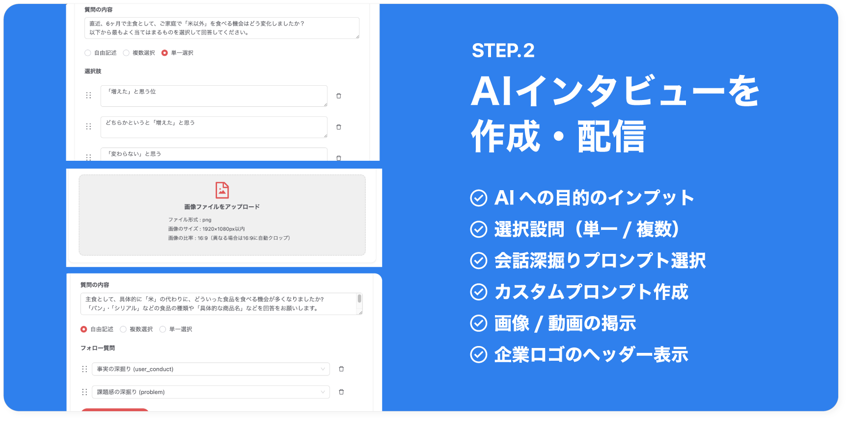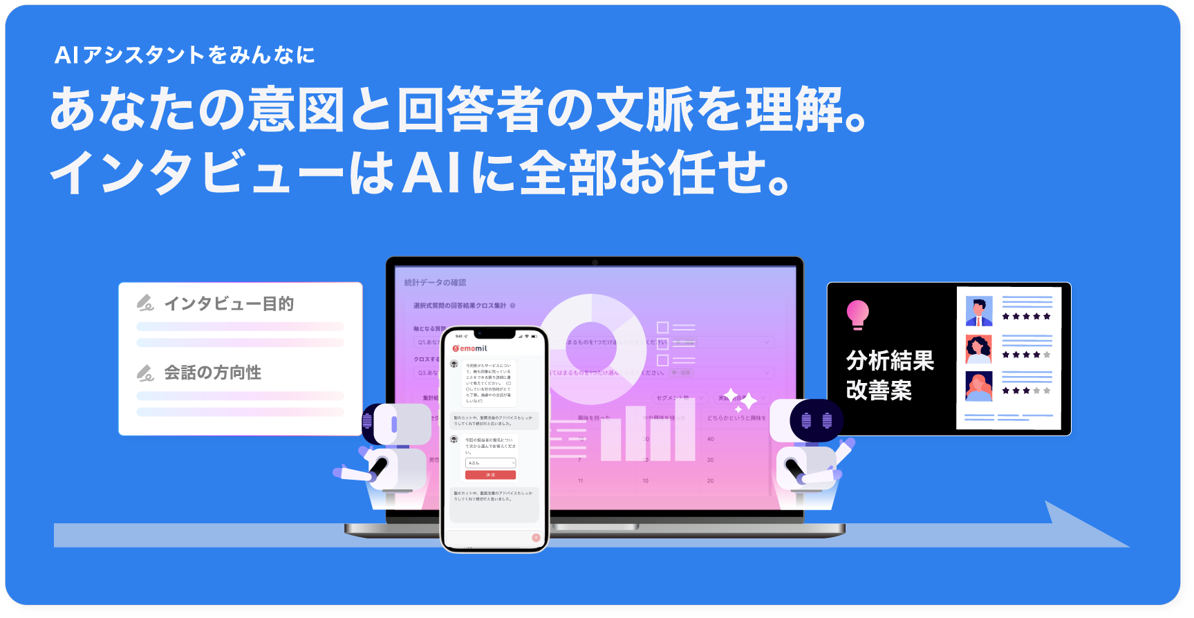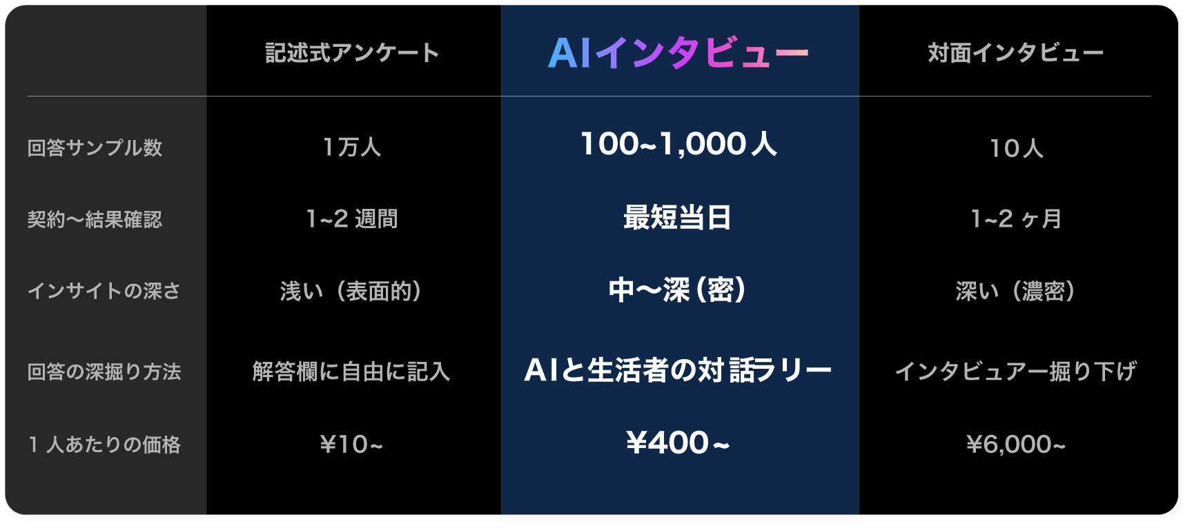 マーケティング・リサーチ、インタビュー、AIの専門知識は一切不要です。 アンケートフォーム感覚で「深くリアルな本音」まで最短で到達します。 AIがあなたの意図を汲んだインタビュアー、リサーチャー、コンサルとして「本音のなぜ?」を掘り起こします。
