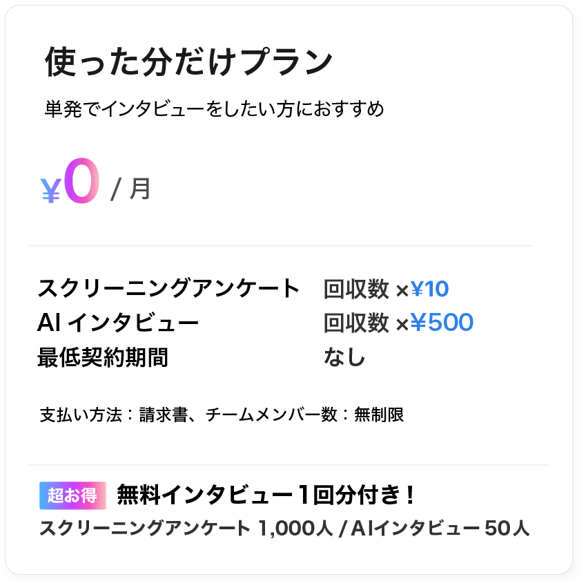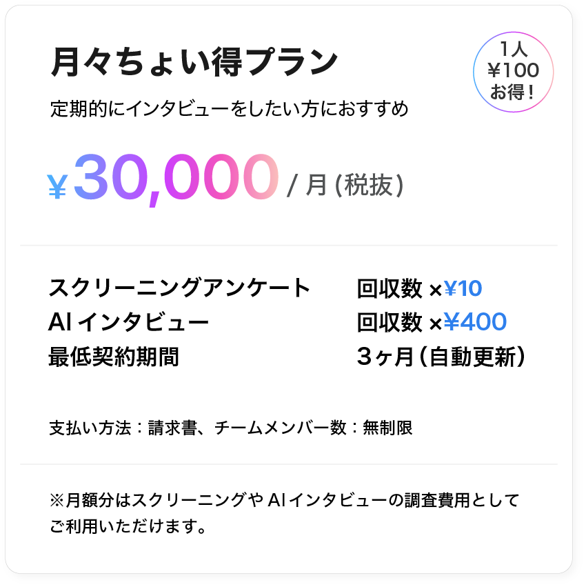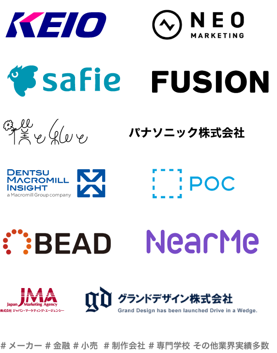 その他の有料オプションでは、マーケコンサルの伴走サポートとして、①調査設計/調査結果FB会:各3万円~、②ご指定の分析軸での集計:2万円~、③レポート作成代行:20万円~などがございます。