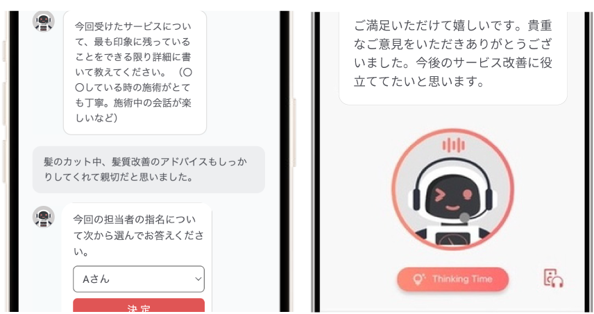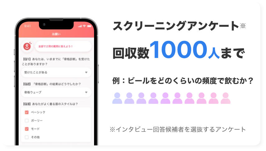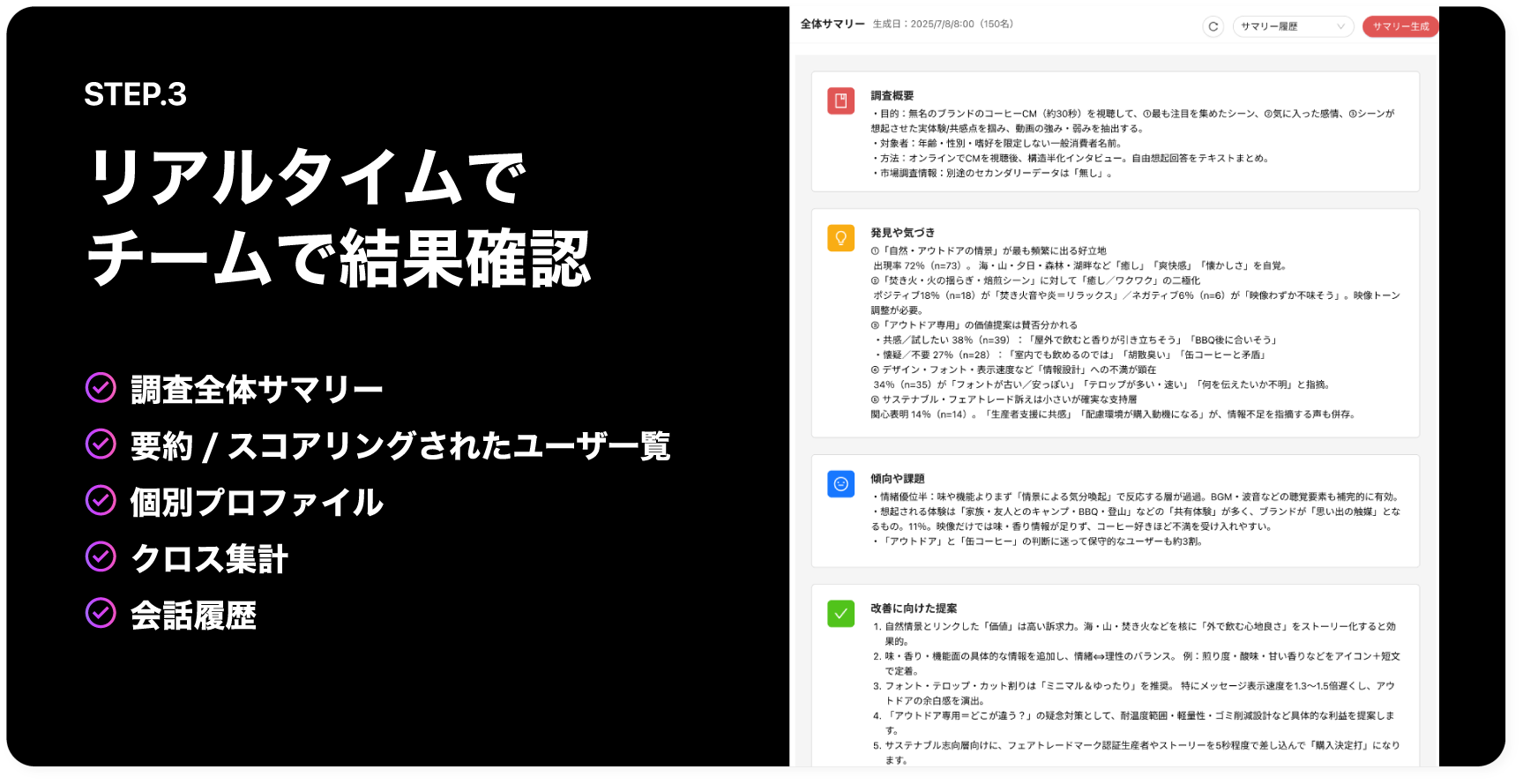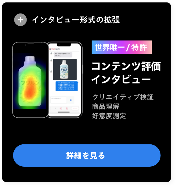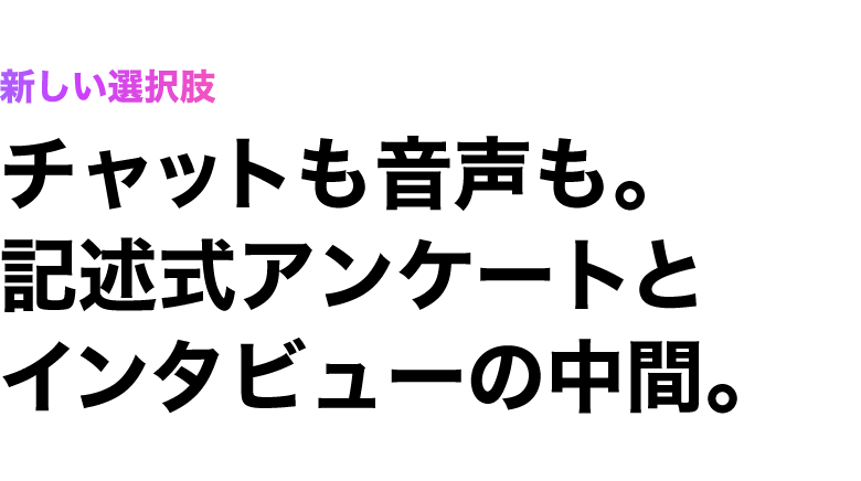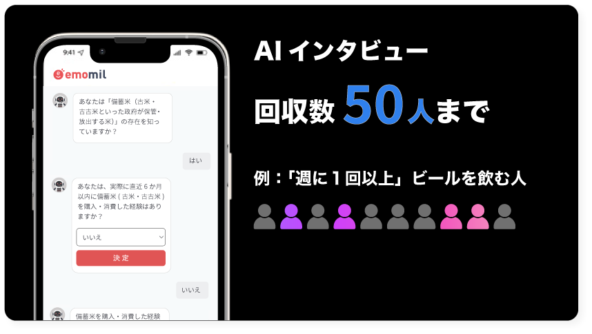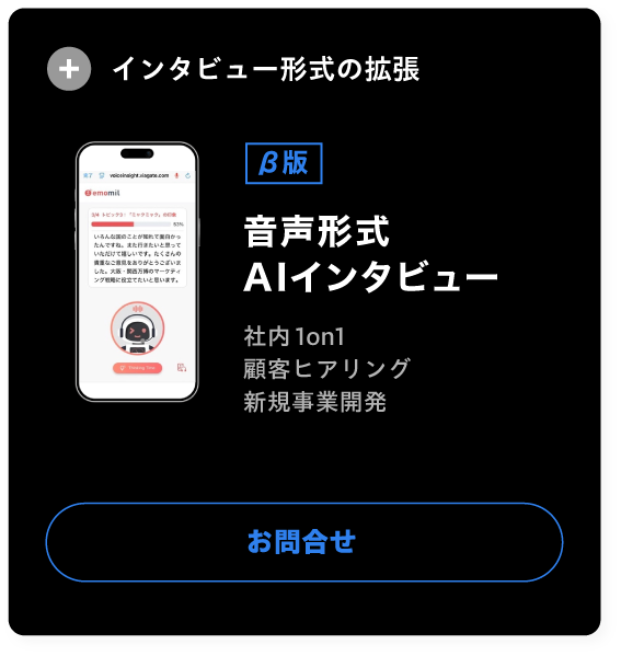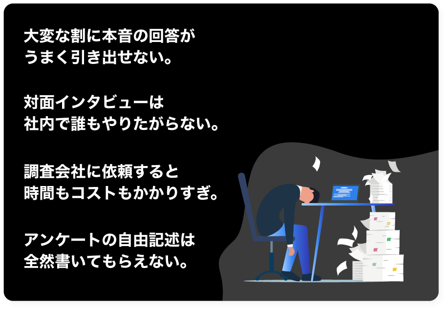 マーケティング・リサーチ、インタビュー、AIの専門知識は一切不要です。 アンケートフォーム感覚で「深くリアルな本音」まで最短で到達します。 AIがあなたの意図を汲んだインタビュアー、リサーチャー、コンサルとして「本音のなぜ?」を掘り起こします。